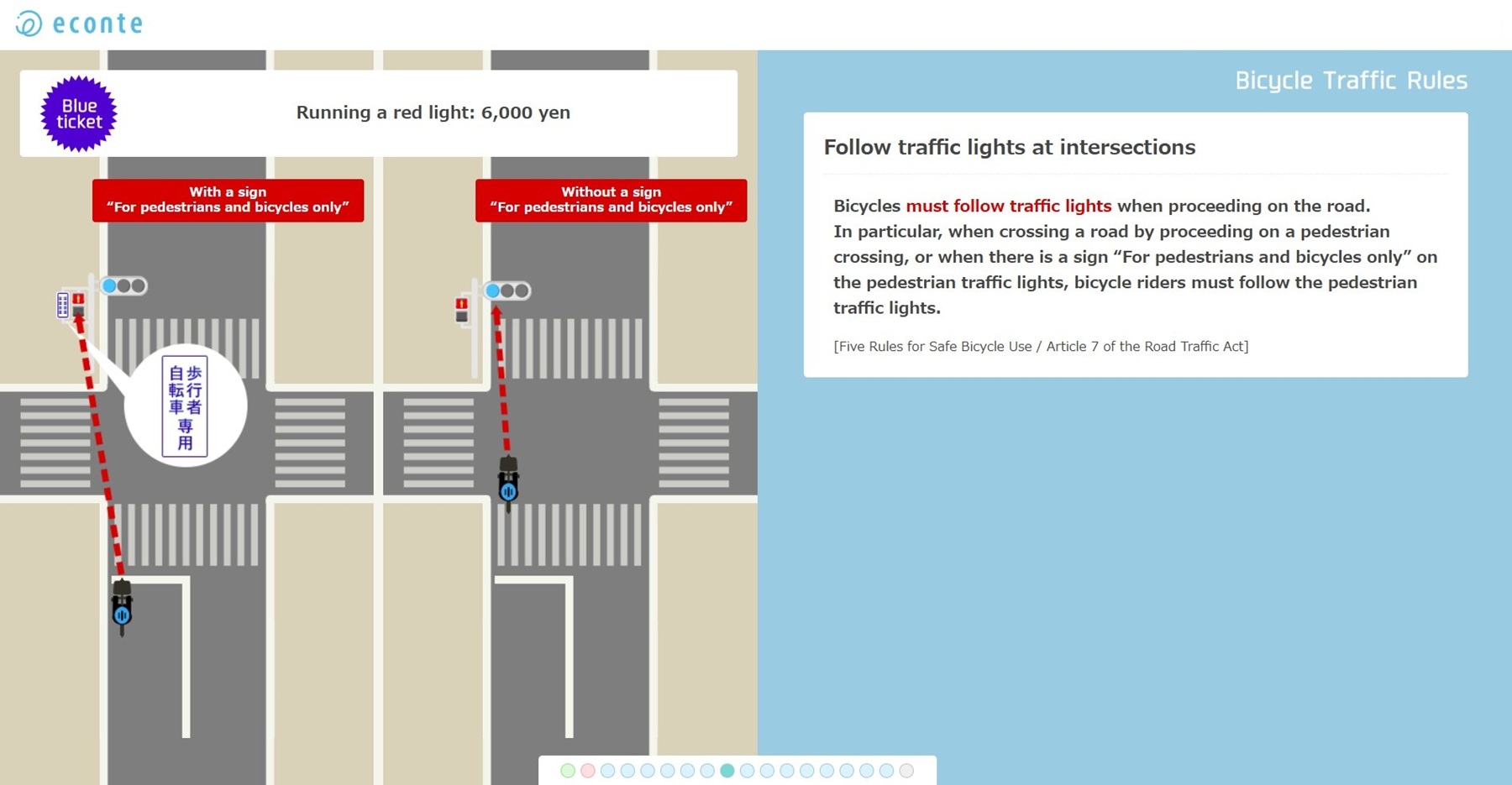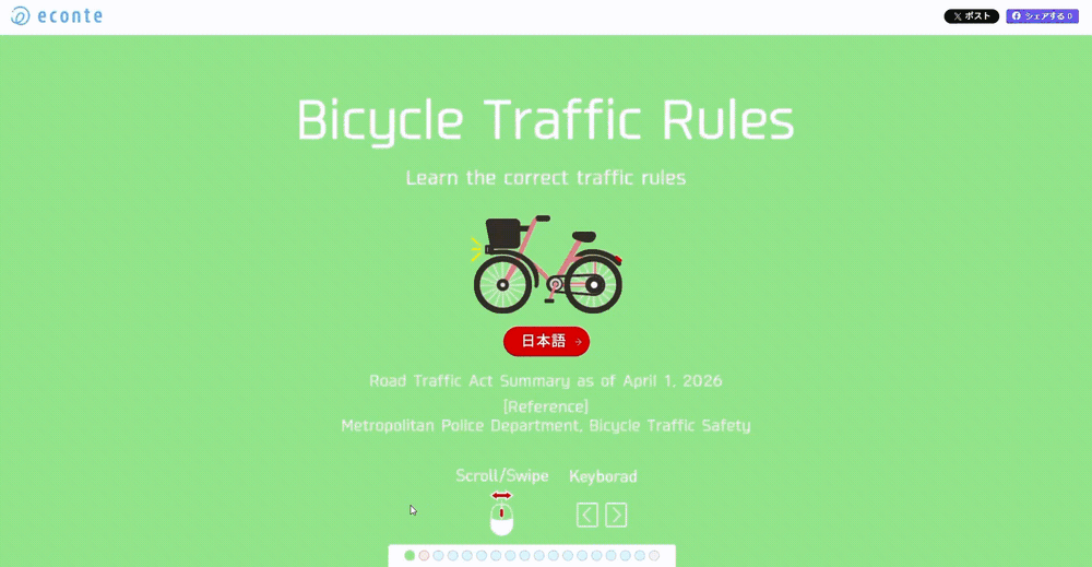 情報設計とクリエイティブで世の中の“いいコト”をわかりやすく伝える株式会社エコンテ(本社:東京都渋谷区、代表取締役:滝日伴則、以下「エコンテ」)は、警視庁・警察庁が公開する交通ルールや法令情報を基に、2026年4月1日施行の自転車の「交通反則通告制度(青切符)」を中心とした主な交通違反の内容や注意点を操作しながら確認できる体験型インフォグラフィック「自転車の交通ルール」の英語版を新たに制作・公開しました。