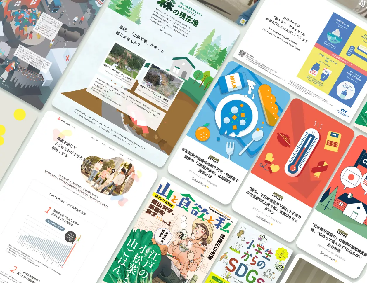 インフォグラフィックは情報を視覚的に伝える表現手法です。 ウェブサイトや書籍の解説に使う図版などのグラフィックから、ポスターや動画まで、インフォグラフィックを活用したコンテンツで社会課題の取り組みをより伝わりやすく表現することができます。
