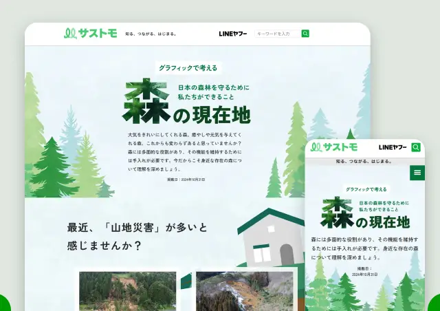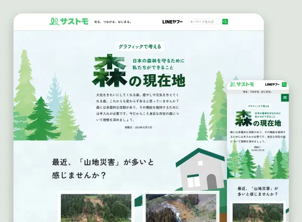 ユーザー向けに、森林の理解促進と行動変容のきっかけを作るための特集LPを制作しました。理解が難しい行政の資料やグラフは柔らかくわかりやすくビジュアル化。イラストを取り入れ、アニメーションなどの動きも加えることで、飽きさせずに最後まで見てもらう工夫をしています。