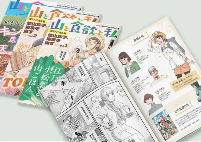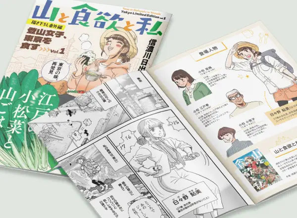 東京産食材の魅力を発信し、認知向上・消費拡大を行うための東京都の施策として、「山と食欲と私」の描き下ろし漫画を制作。エコンテでは、東京産食材の魅力をわかりやすく伝えるカラーページデザインと、制作ディレクションを担当いたしました。