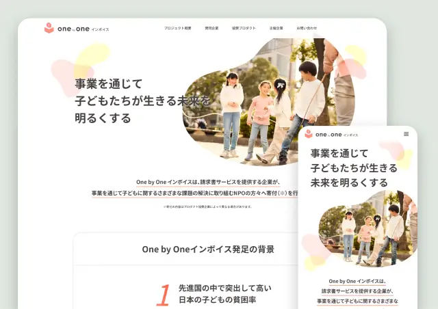 invox様が取り組んでいる「One by One インボイス」を紹介するサイトも制作いたしました。事業を通じて子どもたちが安心して明るく生活できる社会の実現を目指していきたいという理念を発信しながら、協賛いただける企業を募るといった目的のサイトを優しいトーンでデザインしました。
