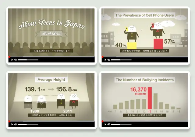 文部科学省や厚生労働省が公表する日本の中学生に関する統計データをインフォグラフィック化したビデオグラフィックです。111年前と比べたこどもの平均身長や結婚願望、いじめの認知件数などの数値をグラフやイラストを用いてわかりやすく表現しています。