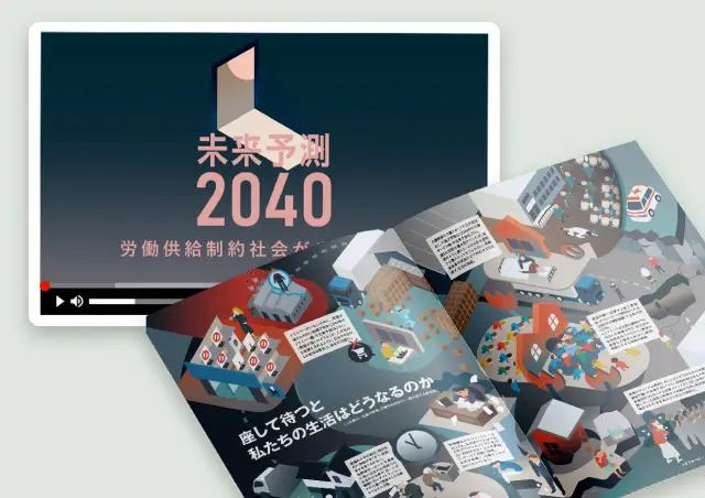リクルートワークス研究所様が行っている研究プロジェクト「Works未来予測20XX」の報告書『未来予測2040』と紹介動画の制作。今後日本が直面する労働人口減少の課題をデータやインフォグラフィック・イラストを用いて、読み応えのある内容を理解しやすく表現、制作しました。