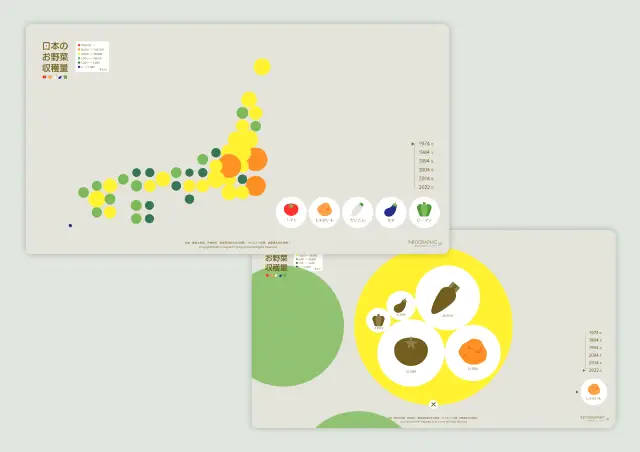 農林水産省の作物統計データを基にした都道府県別の野菜収穫量を円の大きさと色でポップに表現しています。マウス操作で表示データが切り替わるインタラクティブ設計です。日本文教出版株式会社が発刊する「情報Ⅰ図解と実習―図解編」にも掲載されました。