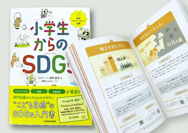 SDGsをはじめて学ぶ、子ども目線のSDGs入門書です。小学校低学年からでもSDGsを無理なく学べるように、直感的に&ビジュアルにこだわって構成されています。エコンテではページ内のインフォグラフィック(図解)の制作を担当しました。